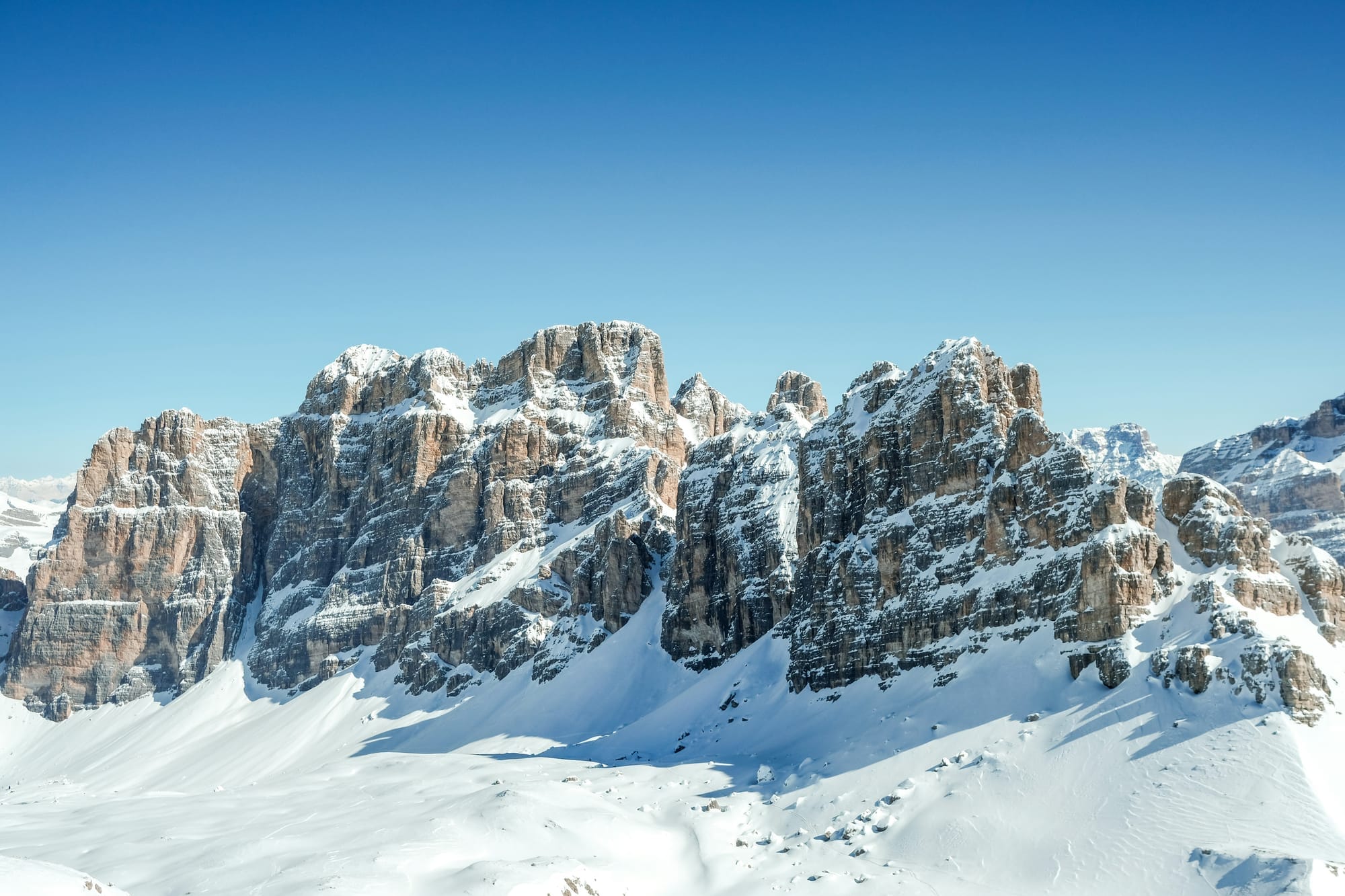 Snow-covered peaks of the Dolomites under a clear winter sky